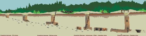 Warstwy krzemienia, zapadając się w kierunku wnętrza synkliny osiągały poziom skał mało spękanych. W obrębie tych skał powstawały kopalnie filarowo – komorowe o głębokości 5 – 6 m (ryc. 3). W przypadku kopalń tego rodzaju szyb, szeroki w jednostkach płytkich, miał średnicę nie przekraczającą 3 m. Był jedynie wejściem do podziemnych wyrobisk, gdzie koncentrowała się cała praca. Charakter górotworu pozwalał na prowadzenie prac górniczych w znacznej odległości od szybu. Długość niektórych komór wydobywczych mogła sięgnąć 8 – 9 m licząc od podszybia. Cechą charakterystyczną jednostek tego typu są skalne filary, mające zabezpieczać stropy przed obwałami. Pozostawiano je najczęściej w rejonie podszybia kopalni. Czasem pewne partie nienaruszonej skały zostawiano na granicy sąsiadujących ze sobą wyrobisk. Dodatkowo strop chroniono poprzez deponowanie w wyeksploatowanych częściach kopalni skały płonej, pochodzącej z urabiania górotworu. Eksploatacja w kopalniach filarowych polegała na wykuciu niszy przyspągowej, znad której obrywano pakiety wapienia. Pracował przy tym już zdecydowanie większy zespół górników. Przynajmniej pięciu ludzi musiało urabiać skałę, obsługiwać transport surowca i nadwyżki skały płonej na podszybie, dalej na powierzchnię, a wreszcie odbierać krzemień i gruz na górze. Z czasem wokół szybu powstawała charakterystyczna hałda gruzowa. Częścią urobku zasypywano opuszczony szyb sąsiedniej kopalni. Jednostki filarowo – komorowe, z uwagi na wielkość jak i względne bezpieczeństwo w nich panujące, musiały funkcjonować co najmniej kilka sezonów.